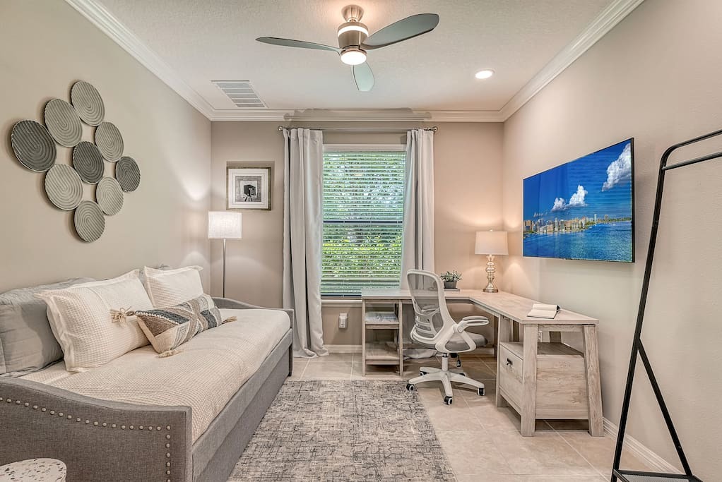 Two sizeable bedrooms fully equipped with flat screen tvs and closets. Plenty of room with the added office/tv room off the french doors. Try the sonos sound system and sound bar on the 75" QLED TV.