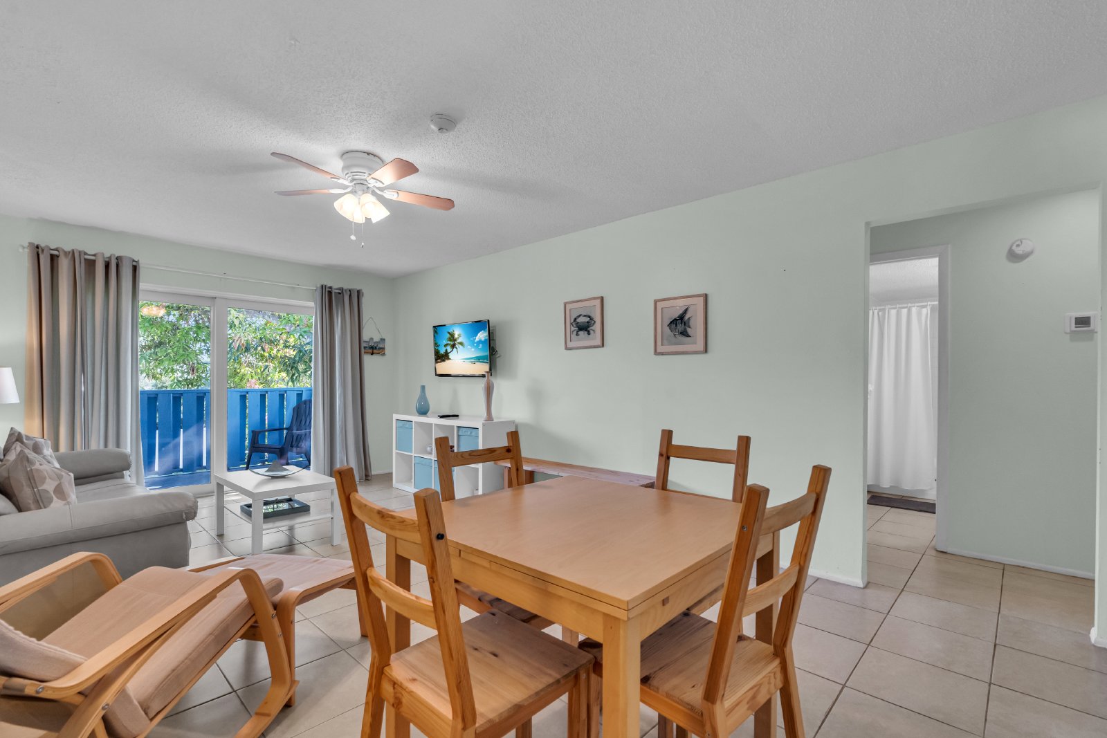 Kitchen and living area with balcony.