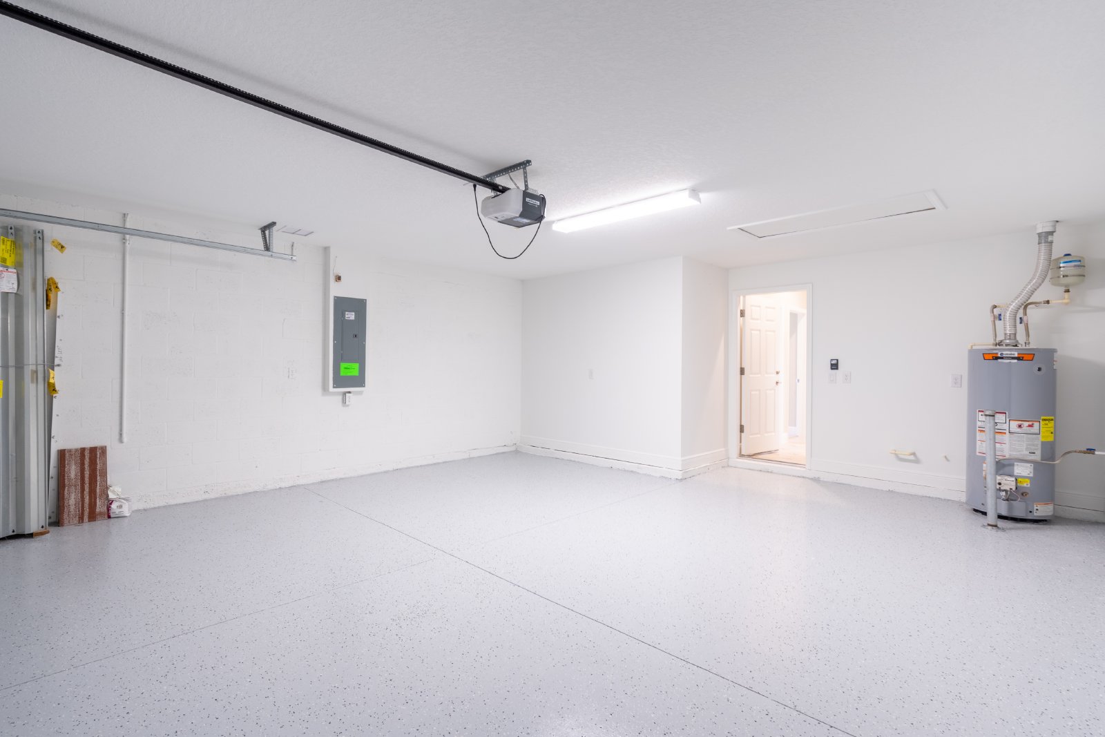 2 car garage with plenty of storage shelves.